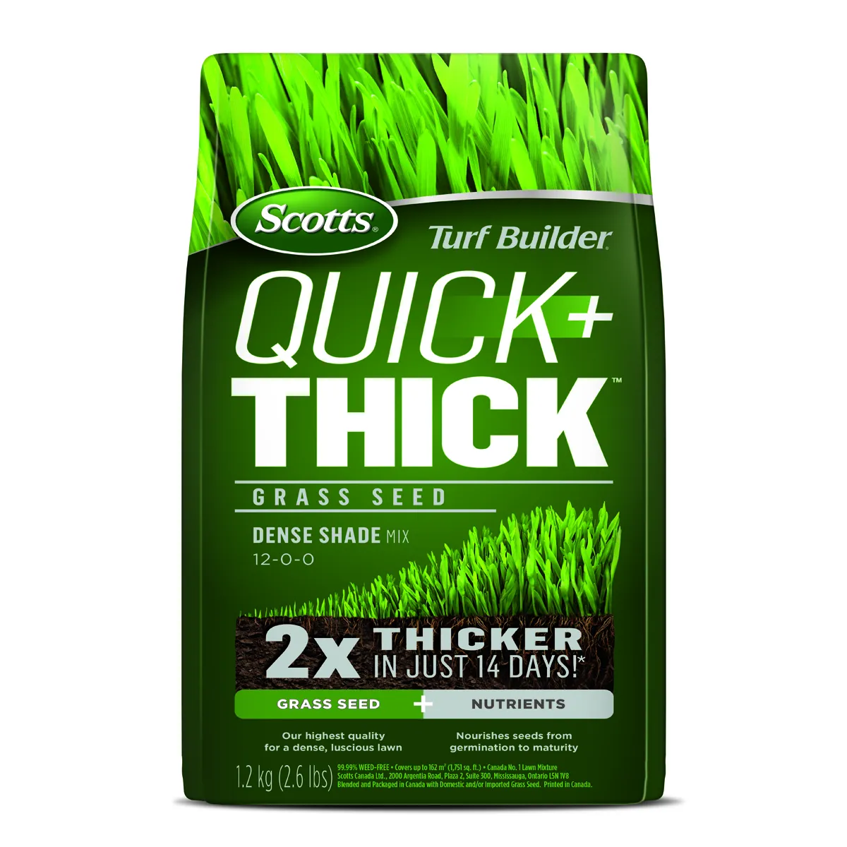 Contains creeping red fescue; chewing’s fescue; turf-type perennial ryegrass; kentucky bluegrass When it comes to growing a lush lawn in areas with not a lot of sunlight; you’ve got it made in the shade with Scotts® Turf Builder® Quick + Thick grass seed dense shade Mix 12-0-0. Grows grass 2X thicker - in just 14 days!* Our exclusive mix contains our highest quality grass seed plus a special blend of slow-release fertilizers. So; seed not only gets a quick start; it grows into thick; green grass that lasts. 99.99% weed-free grass seed made just for shady areas. Ideal for overseeding existing lawns. Great for establishing a new lawn on bare soil.
