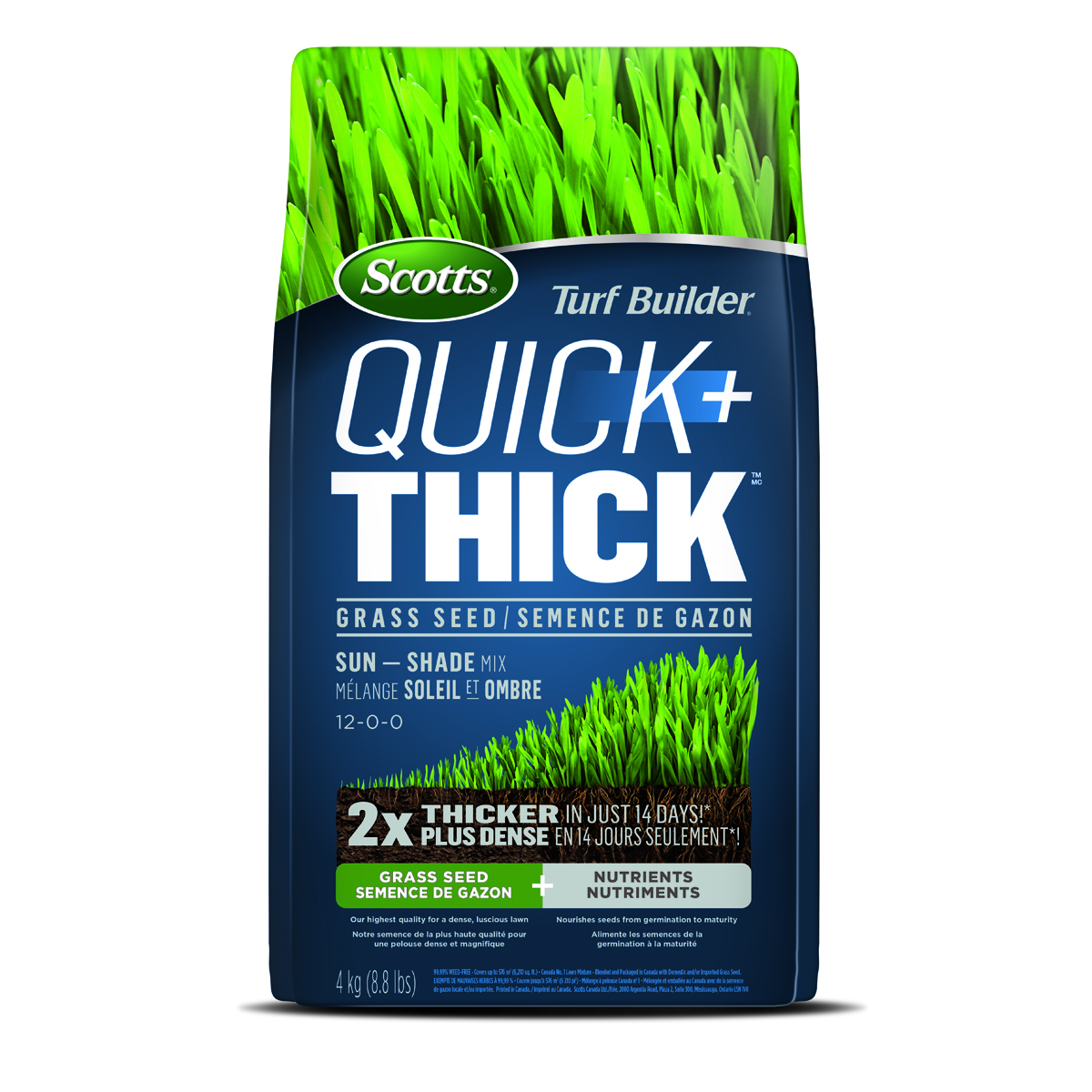 Scotts turf builder quick + thick grass seed sun - shade mix 4 kg grow thick green grass that lasts fast grows 2x thicker in just 14 days 99. 99% weed-free grass seed + a special blend of time-release nutrients contains creeping red fescue turf-type perennial ryegrass kentucky bluegrass 4kg (8. 8lbs) covers up to 576 m2 (6 210 ft2) scotts scotts turf builder quick + thick grass seed sun - shade mix 4 kg.
