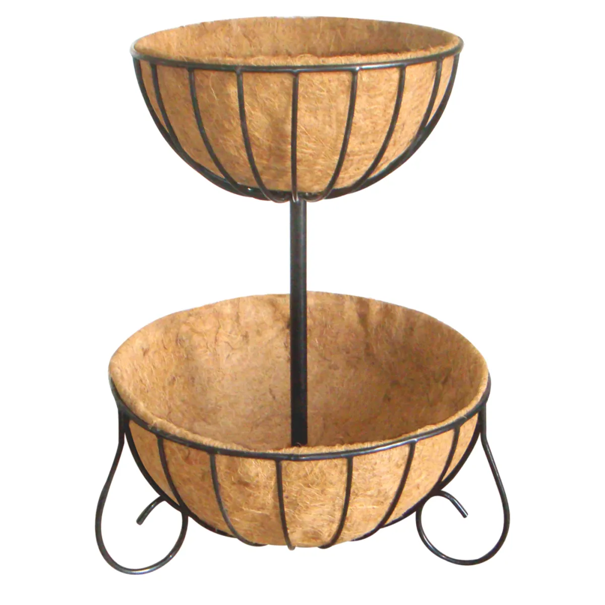 Two-Tiered Wire Planter Basket with Coco Liner 18in and 23in Gloss Black