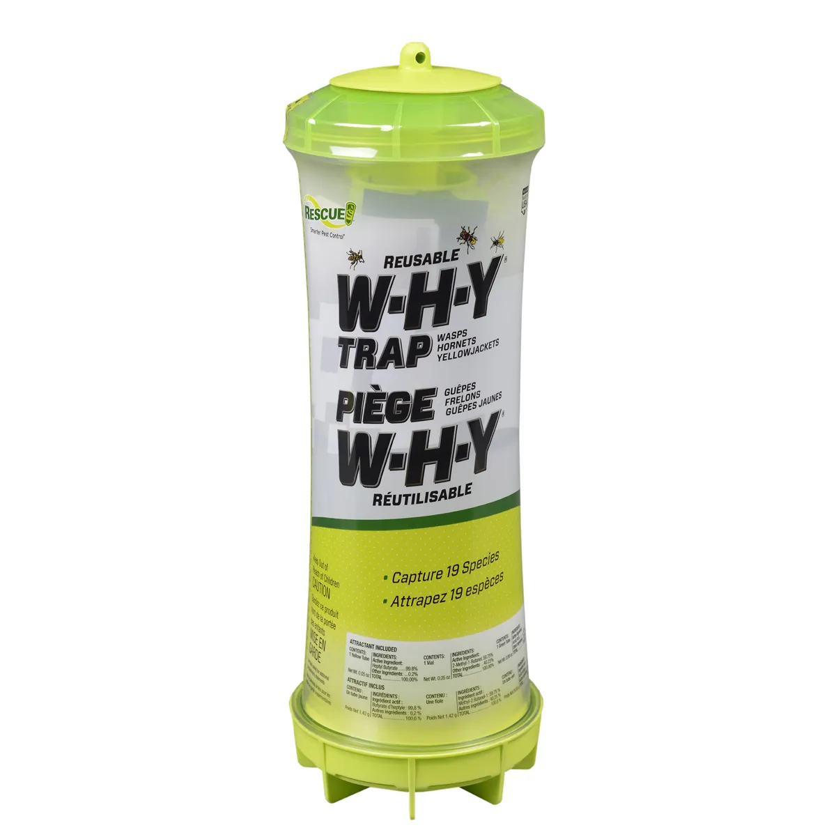 The RESCUE! Reusable Non-Toxic Trap for Wasps, Hornets, and Yellowjackets is the only all-in-one, environmentally responsible answer for battling wasps, hornets and yellow jackets. The trap is proven to catch Paper Wasps, Red Wasps, Bald-faced Hornets, European Hornets and Yellow Jackets. This trap catches insect queens in early spring before they build nests, and foraging workers from late spring through summer and fall. The trap has a top chamber and a bottom chamber. The top chamber is baited with two attractants, one of which is a solid contained in a vial, and the other a liquid mixed with water. The bottom chamber is baited with a liquid attractant poured onto a cotton pad. Wasps, hornets and yellowjackets have two ways to enter: either through the top cap, or through the holes in the bottom cap. Once inside the trap, the insects cannot fly out and die either by drowning (top chamber) or dehydration (bottom chamber).