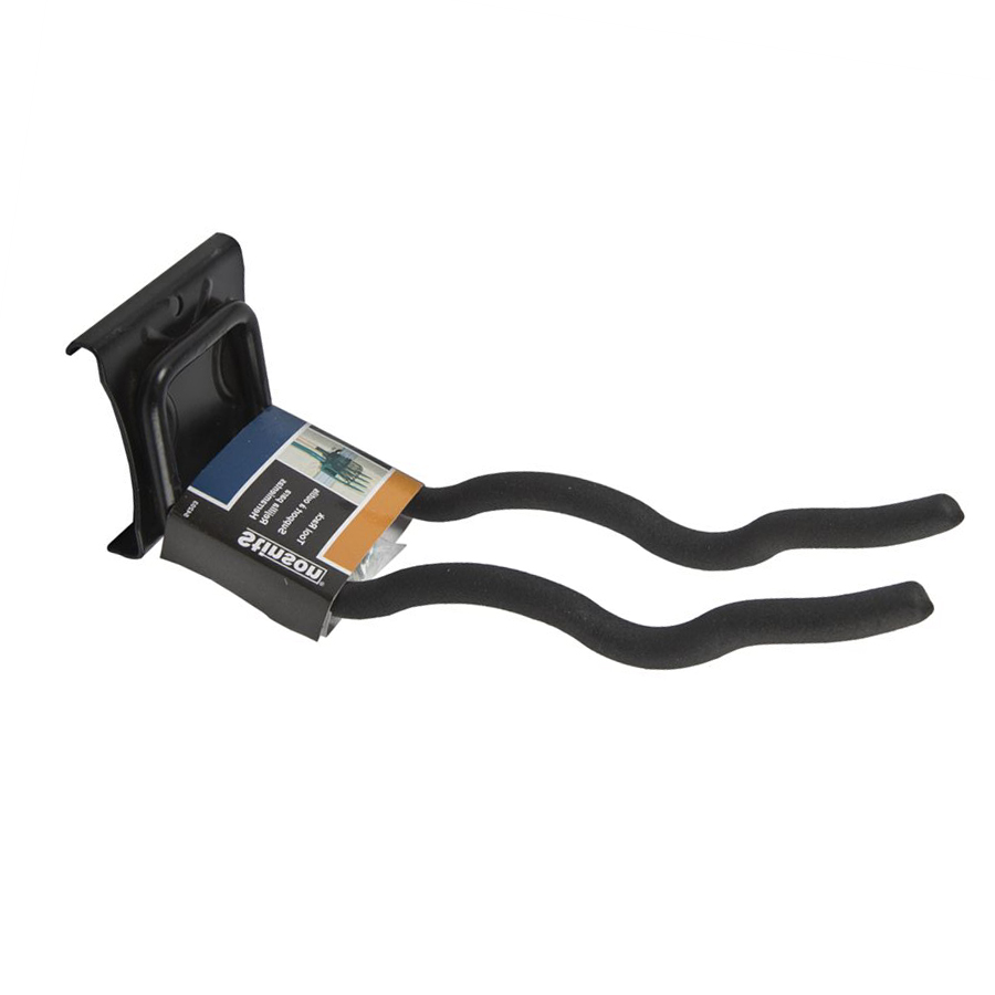 Supports: Up to 50 lbs Flips up flat against wall when not in us. Design to mount to a single wall stud. No-mar 11 in vinyl coated 3/8 in diameter arms curved every 2 in. Hang weed wackers; shovels; hedge trimmer and more. Powder coated finish. Easy to install - hardware included. Supports: Up to 50 lbs.