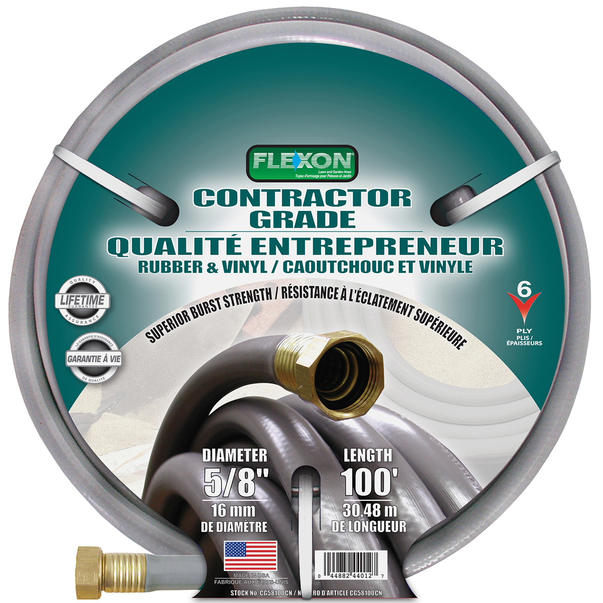Made in USA The Flexon contractor Grade garden hoses has superior strength in the toughest applications. The Flexon contractor Grade hoses have a high burst strength; crush proof couplings & are ideal for landscaping; jobsites; & cold weather conditions.
