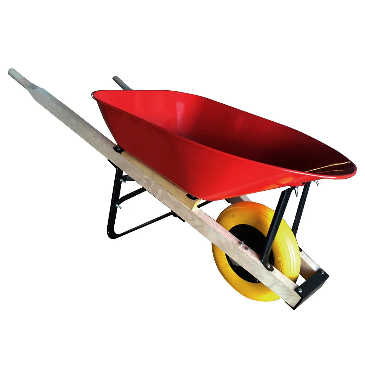 Contractor Grade 6 cu.ft Wheelbarrow This easy roll and dump wheelbarrow is loaded with features such as bolt-less steel tray with rolled edges and a narrow mouth. Features heavy duty tray braces, 3 bearing wheel construction ( 2 ball bearing/1 linear bearing) and 62" ashwood handles. Flat free polyurethane solid tire.