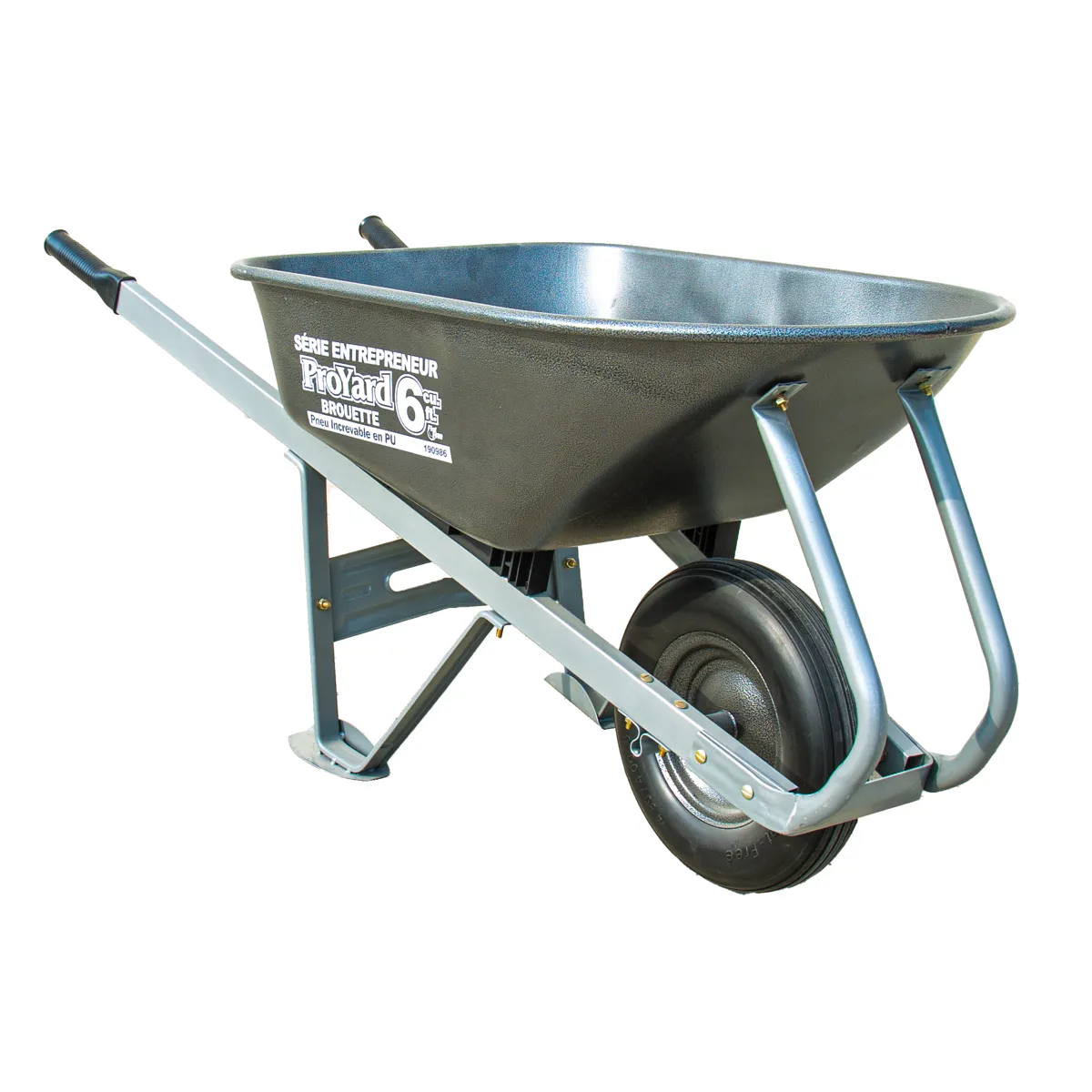Transport and dump dirt, mulch, gravel and other materials with the ProYard steel tray wheelbarrow with easy roll and dump bars. Loaded with features such as bolt-less steel tray with rolled edges and a narrow mouth, easy roll and dump bars, patented extra wide legs and feet, 3 bearing wheel construction ( 2 ball bearing/1 linear bearing) and 59" square steel handles with cushion grip. Flat free polyurethane solid tire.