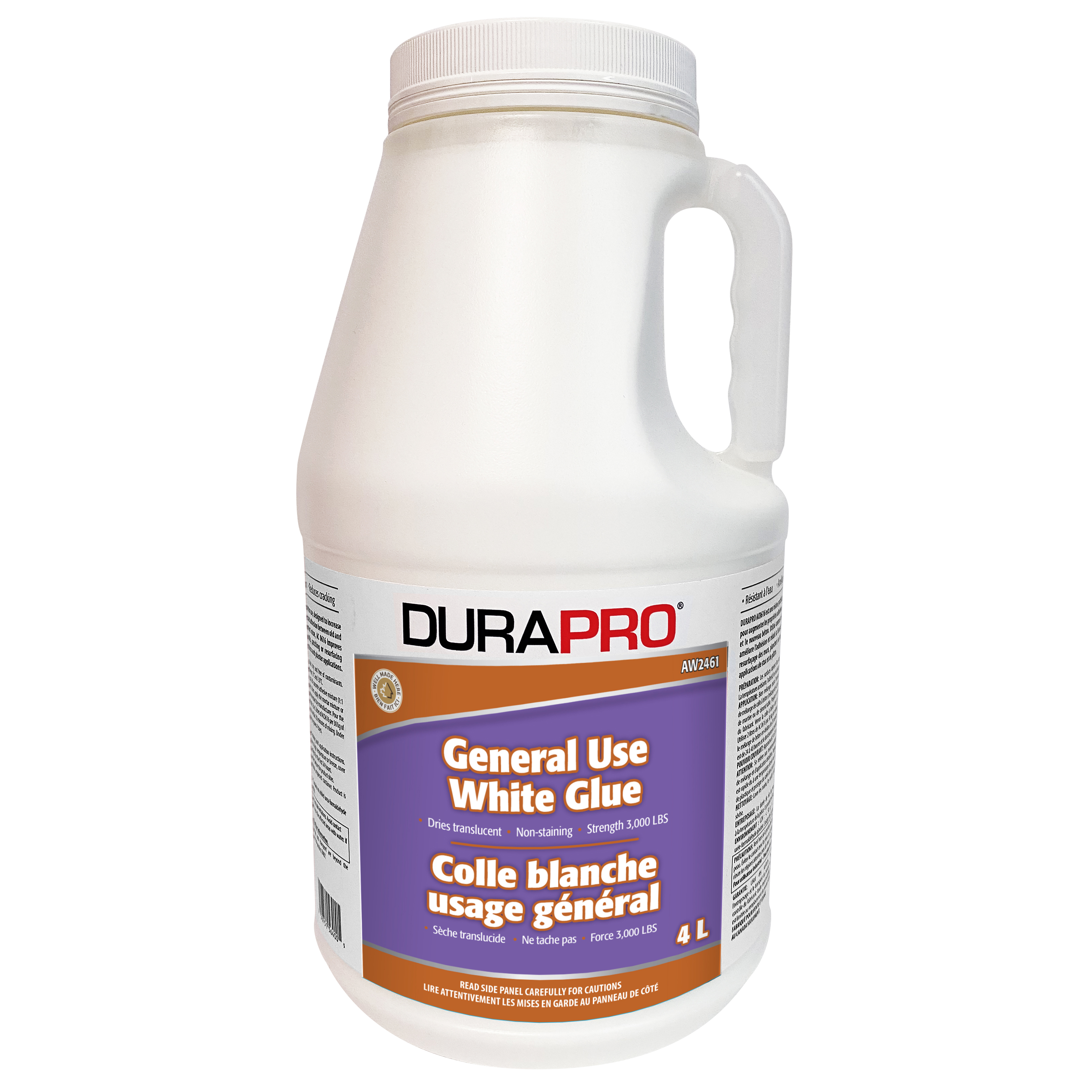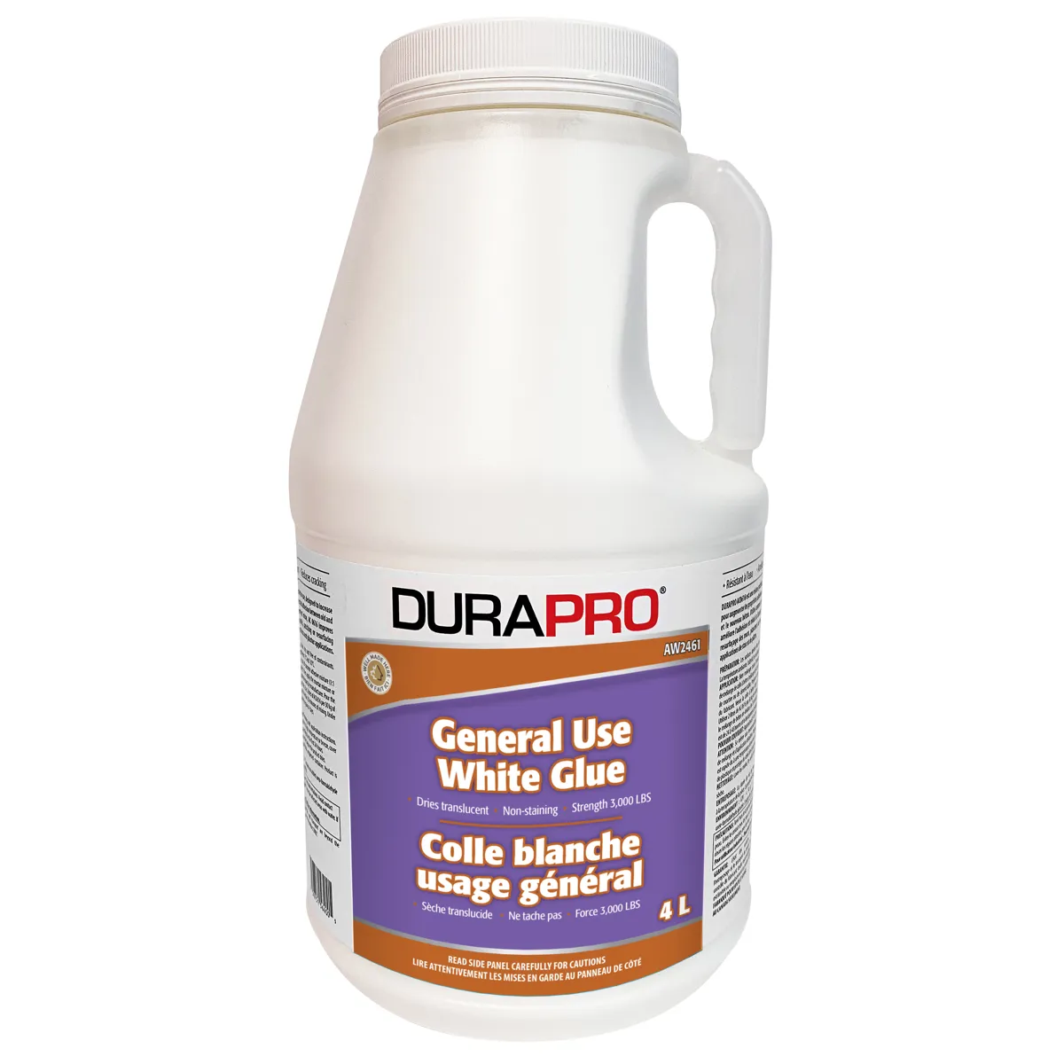 DURAPRO White Glue is an economical white glue for general wood assembly; wood lamination and edge gluing. It is also used for crafts projects made from paper; cardboard; fabric; leather; wood; felt; and many other porous materials. When dry; the glue gives a translucent glue line that sands easily and is unaffected by finishes.