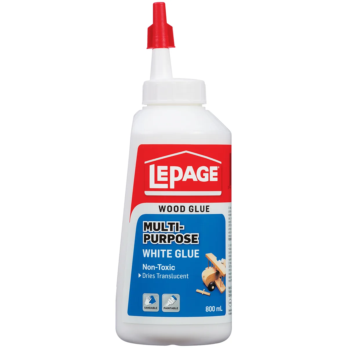 LePage® multi-purpose white glue is a versatile; general purpose; polyvinyl acetate woodworking adhesive. It is particularly suited for high strength; permanent bonding on wood and a variety of other porous materials. Once dried; the bond strength exceeds the strength of the wood itself. Joints can be readily repositioned and realigned during the initial clamping stages. LePage® multi-purpose white glue is non-staining; paintable and sandable. It is water based; safe to use and non-flammable. Uncured adhesive can be easily cleaned up with soap and water. Multi-purpose white glue is non-toxic as per US Federal Consumer Product Safety Commission; ASTM D 4236 and contains no urea formaldehyde.