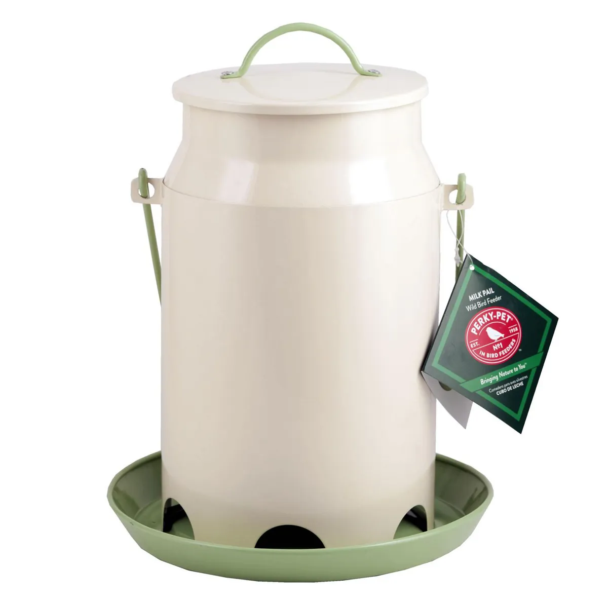 Looking for a charming addition to your feeding stations? With classic milk canister silhouette and earthy coloring, the Perky-Pet Milk Pail Feeder is the perfect rustic touch for any backyard setting. This feeder doesn’t just look great – it offers a large capacity, too! The pail can hold an astounding 5 lb of mixed seed or sunflower seed to ensure your hungry backyard birds are always well fed. In addition, the Perky-Pet Milk Pail Feeder boasts a tightly sealing lid and drainage holes to keep seed fresh and dry in any weather. Meanwhile, the feeder’s spacious seed tray limits waste by catching seeds and promotes 360-degree feeding so more birds can dine at once. For your convenience, the milk pail lid twists off easily to allow for effortless filling and cleaning. With such a large reservoir, you’ll have no problem reaching all the nooks and crannies as you clean. The Perky-Pet Milk Pail Feeder offers a durable, all-metal construction to ensure years of use in your backyard. Use the built-in hanging hook to place the feeder anywhere around your property.
