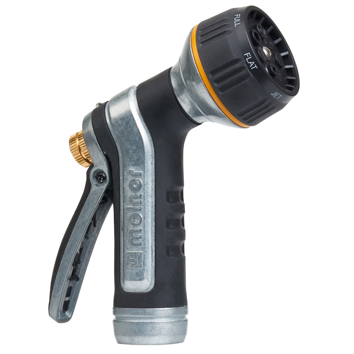 This heavyweight nozzle can be used for a variety of gardening chores and stands up to even the toughest watering needs. The 7-pattern adjustable sprayer provides watering options from a fine spray to a powerful jet. A rubberized slip-resistant grip makes it easy to handle and control while remaining comfortable in your hand.